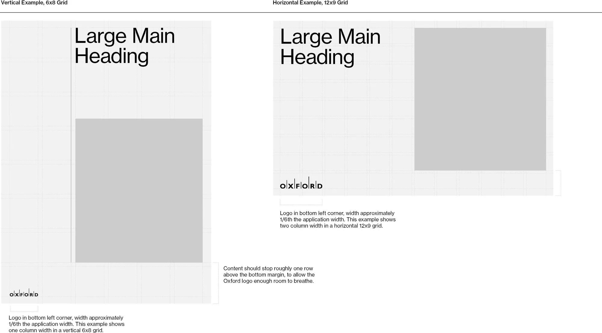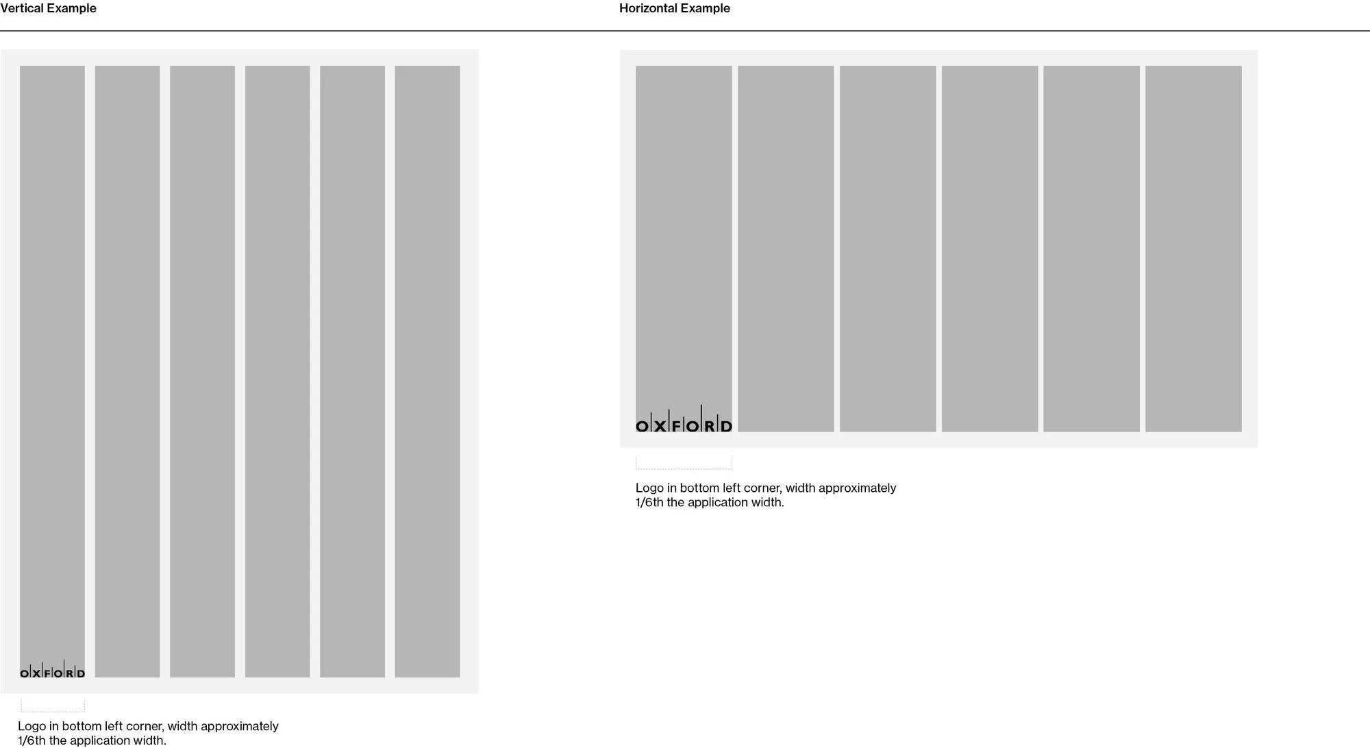 The Oxford logo should always be placed in the bottom left corner of any application. The logo proportions are roughly based on the width of two columns in a 12-column grid, or approximately 1/6 the width of the application.